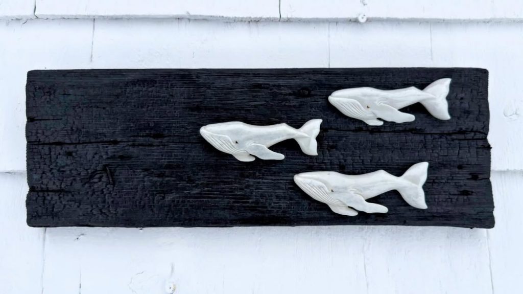 All of these carved bone whales were hanging on the walls of my booth at the Farmers’s Market and were covered in a heavy layer of ash after the Christmas Day fire. The whales have been through an elaborate cleaning process, and while retaining a patina from the ash, smell only of Dawn dish soap now. I did throw out all of the bases and remounted them on driftwood. As an homage to their fiery history, I have finished the bases with Yakisugi, the Japanese technique of charring wood as a means of preservation. The wood has been deeply charred, lightly brushed and sealed with several coats of matt varnish. For the time being, I don’t have a wall at the interim market to display larger wall pieces. The three-whale piece (Pod} can be seen in my tiny galley along with a growing collection of larger wall sculptures. @peiartsandheritagetrail The small whale pieces can be seen @charlottetownfarmersmarket #bonecarving #yakisugi #whaleart #humpbacks #rightwhale