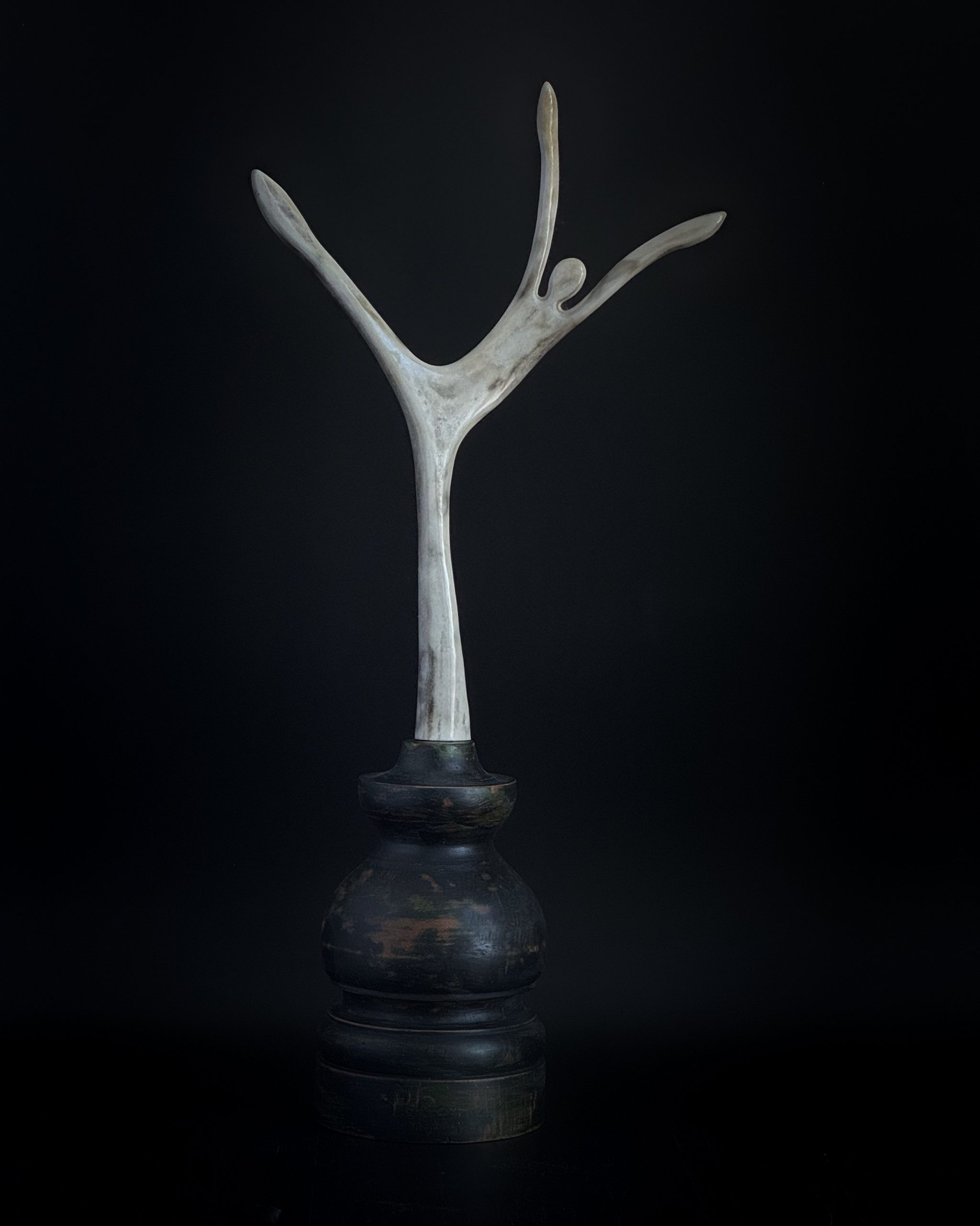 If you have ever poked around a tide pool at low tide on PEI you may have been lucky enough to see a starfish They might be spread out flat on the bottom, or draped over a rock or shell or piece of driftwood. This starfish is carved from beef bone, and is mounted draped over a naturally finished piece of island driftwood. The wood is 12” long x 5” high. The starfish is 4” long and 2 1/2” deep