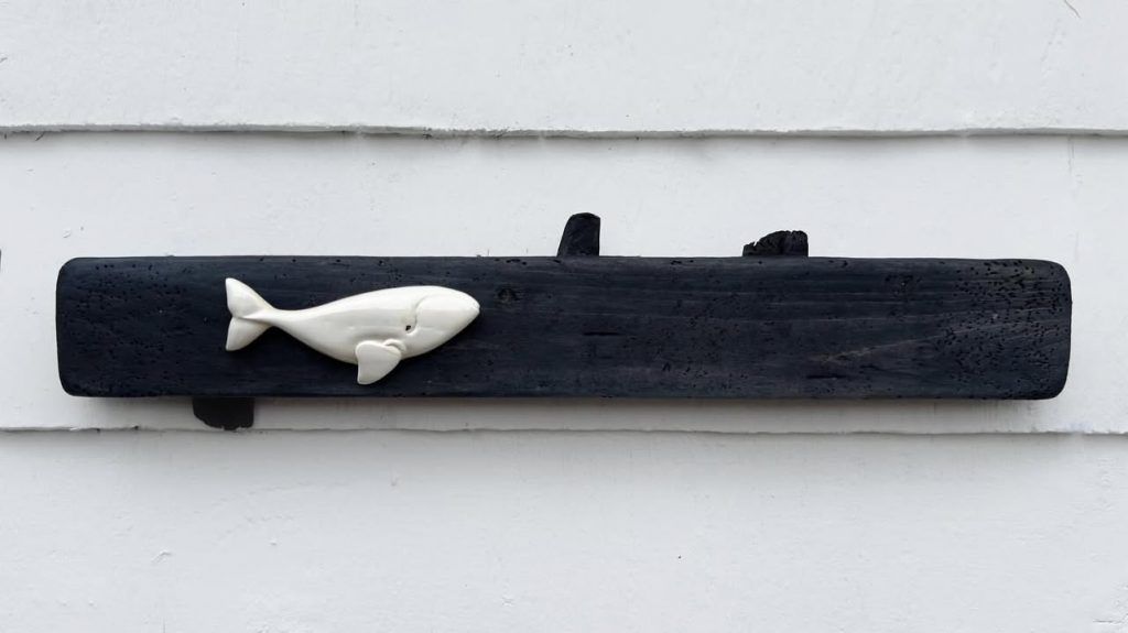 I tend to carve a lot of humpback whales as they are the most charismatic of the large whales. However, the status of the North Atlantic Right Whale as one of the most endangered whales species makes them an important subject matter. Given that the Right whale is more “serious” than the humpback, I chose a grey paint for the driftwood – a grey close to the colour of right whales. The drift wood base is a piece of lobster trap. Ironic, as an estimated 85% of the current population of right whales has experienced an entanglement with fishing gear. 14” x 4” , the whale is 5” long.