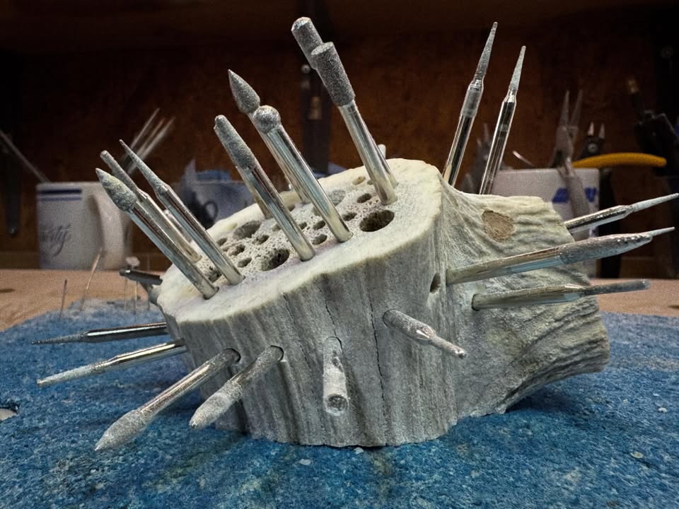 Sputnik. Sometimes, you just gotta stop, mid carving project, and make a holder for the out-of-control burrs. And then you made a Sputnik! Diamond tip burrs in an elk antler burr stand. Probably one of a kind. #sputnik #carving #bonecarving #workbench #elkantler