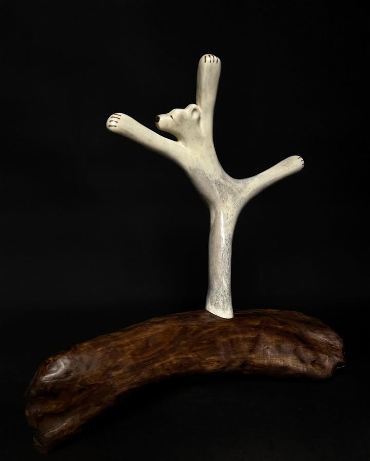 Waltzing Bear. I’ve carved a few dancing bears in recent years, but this is by far the biggest one. This happy guy is carved from moose antler and mounted on painted driftwood. 15” x 15”. Check him out at @charlottetownfarmersmarket or in my tiny gallery @peiartsandheritagetrail #waltzingwithbears #happybear #happydance #antlercarving #bonecarving #boneart #antlerart