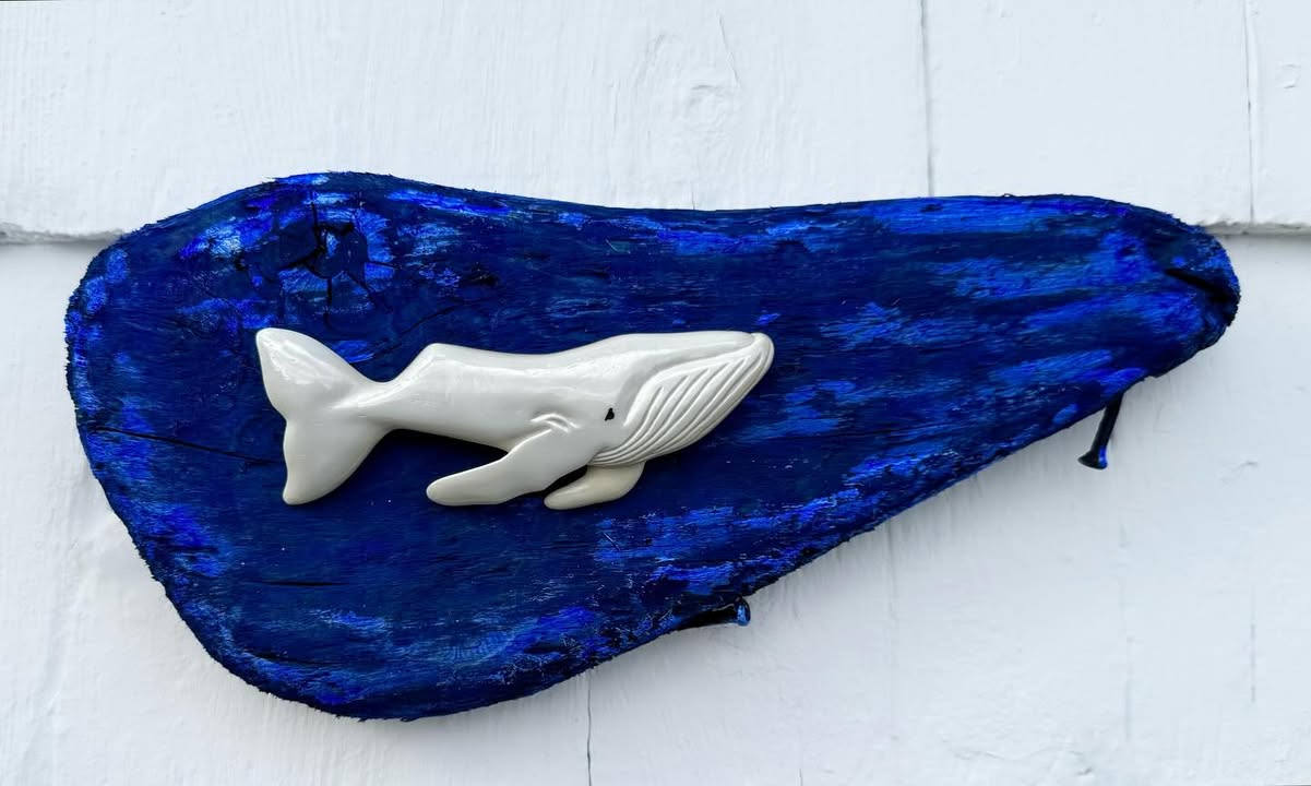 Ultramarine Blue. Humpback whales are one of the most gregarious of the large whales. Ultramarine blue on driftwood suits their often cheerful personalities. This whale is carved from beef bone. The base is 12” x 5”. He will be @charlottetownfarmersmarket or send me a DM for more details. #humpback #humpbackwhale #carved #bonecarving #boneart