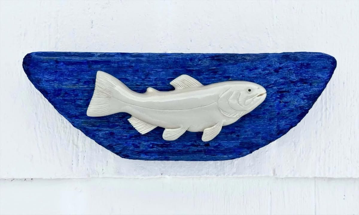 Ultramarine. This carved bone trout was originally mounted in a frame, but had to be remounted after the market fire. The driftwood had that silvery grey effect that makes the ultramarine blue paint appear to glow. Wall mounted. 3” x 9”. I’ll have this @charlottetownfarmersmarket , or let me know if you’d like to see […]